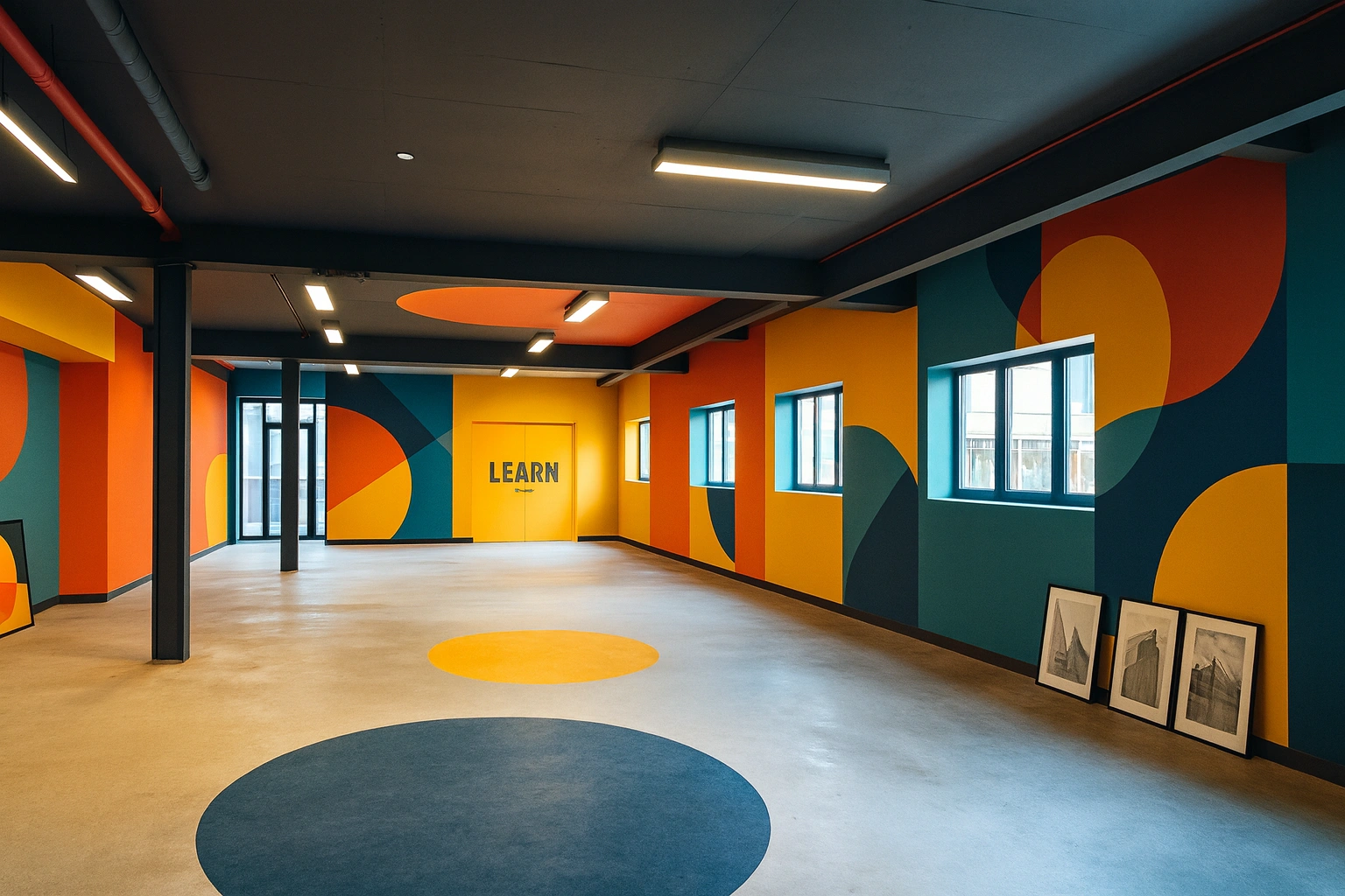 Interior buildout begins: creative zones, tech lab, mentorship rooms, wellness space.